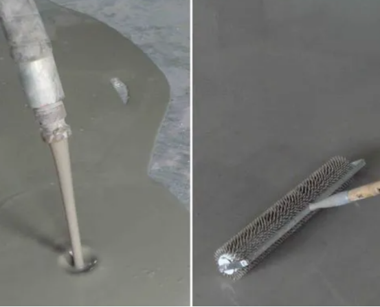 ②將底涂劑(也稱界面處理劑)用輥筒均勻涂刷在清潔后的地面基層上,如基層吸水性較大,底涂迅速被吸干時,則必須再底涂一次。