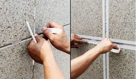 用膠槍裝上耐候膠(硅酮膠)進(jìn)行密封、勾縫處理,修刮平整后撕下美紋紙。