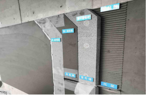 施工步驟:基層檢查 ——彈掛線——熱固復合聚苯乙烯泡沫保溫板粘貼——錨栓安裝——抹面層施工——飾面層施工。
