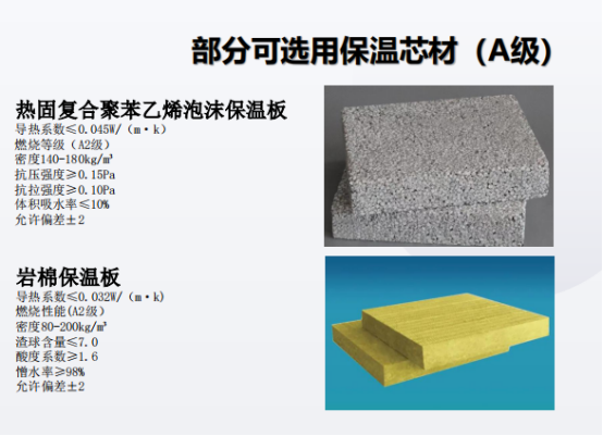 保溫芯材可選:熱固復合聚苯乙烯泡沫保溫板、巖棉保溫板、真金板、聚氨酯板等。