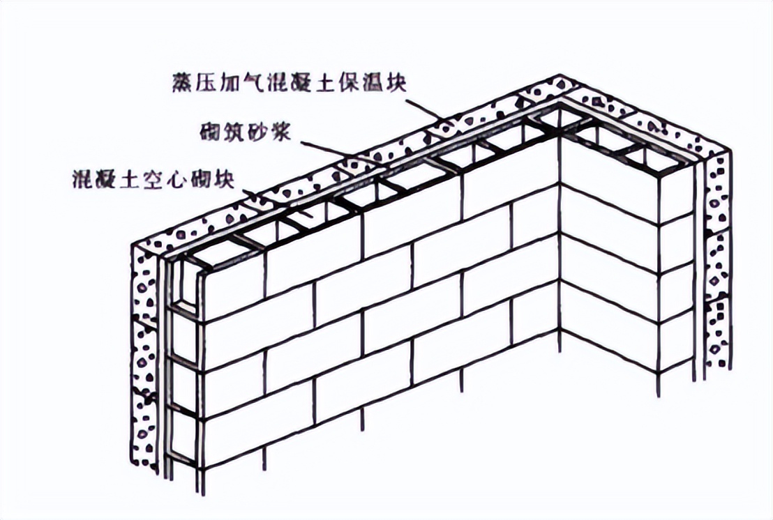 (3)自保溫體系復合外墻:如蒸壓加氣混凝土砌塊復合保溫外墻。復合保溫外墻的外圍是蒸壓加氣混凝土保溫塊圍護結構,起保溫作用,內層是混凝土空心砌塊墻或現澆混凝土墻,起支承作用。中間層是砌筑砂漿,起粘結作用。復合保溫外墻的構造作法原則:在寒冷和嚴寒地區宜采用B03或B04級制品做保溫材料。